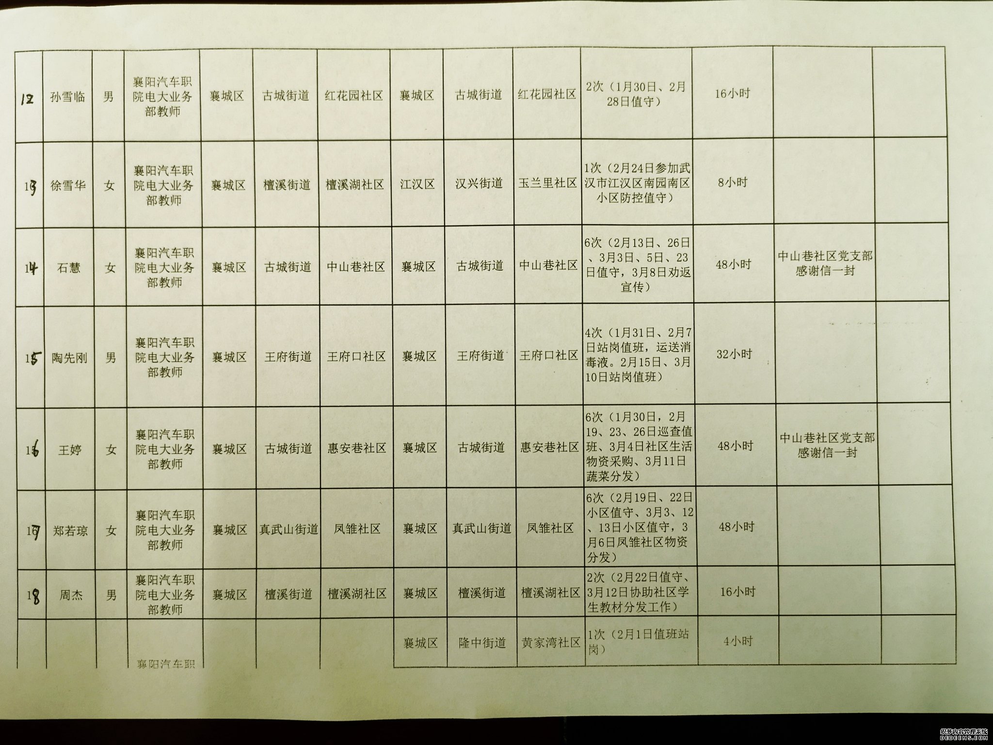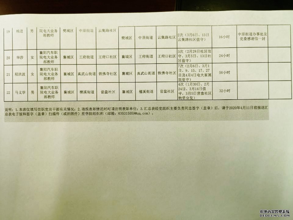在突如其来的疫情肆掠之际,襄阳电大全体党员干部抛开个人安危于不顾,积极响应党中央号召,响应襄阳市委市政府号召,按照学院党委和电大党总支要求,以“积极抗疫,舍我其谁”的担当,通过多种方式积极参加社区“双报到”活动,冲在抗疫一线,用生命和行动诠释了党员的优秀品质。