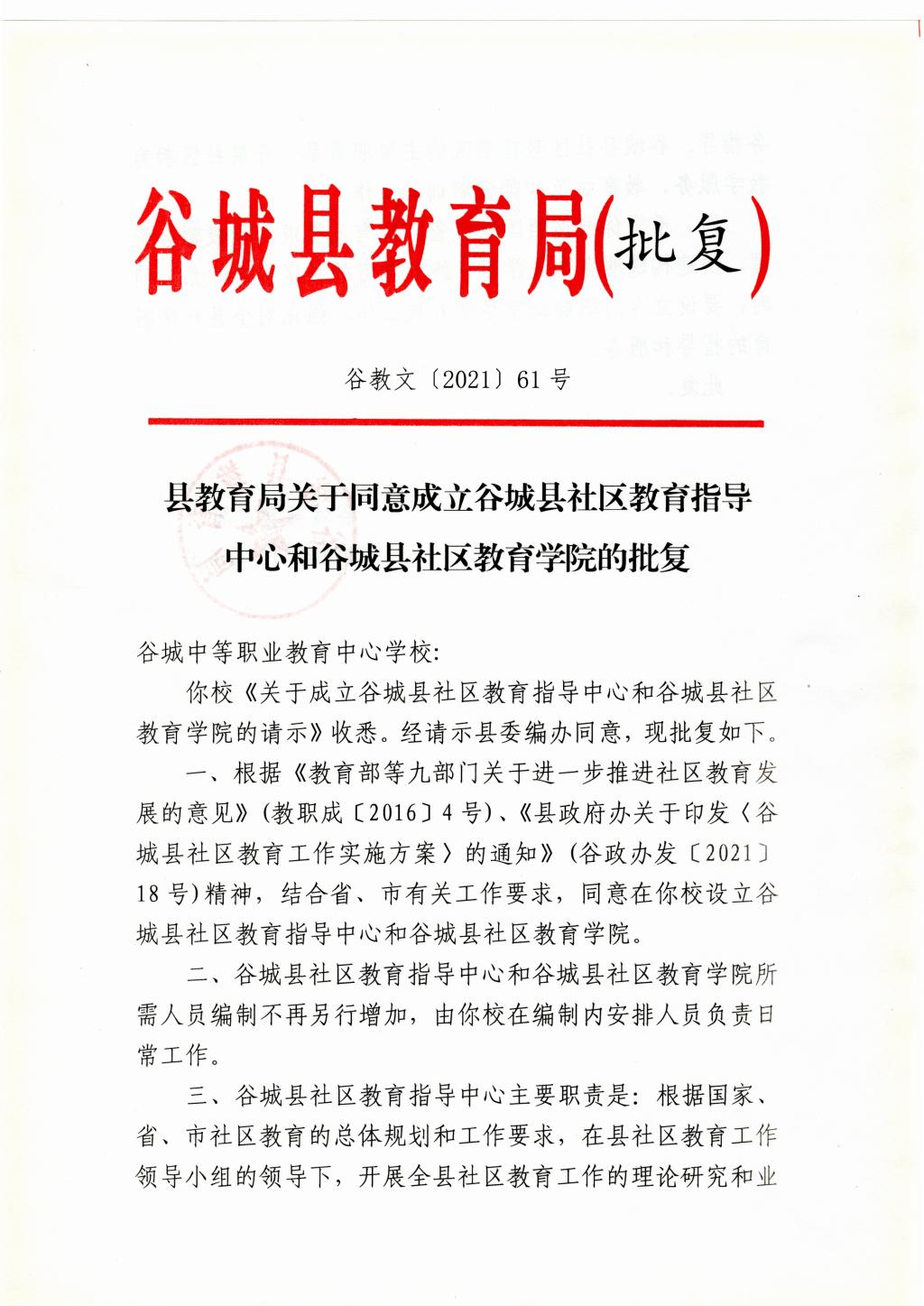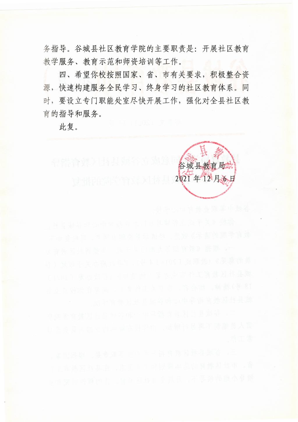 (通讯员 周修刚/文) 12月6日,谷城县教育局根据《教育部等九部门博鱼登录进一步推进社区教育发展的意见》(教职成[2016] 4号)、《谷城县社区教育工作实施方案》(谷政办发[2021] 18号)文件精神,结合省、市有关工作要求,批准在谷城职教中心设立谷城县社区教育指导中心和谷城县社区教育学院。
