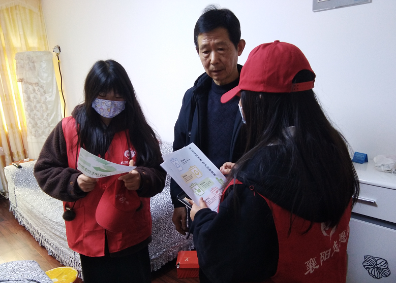 在社区工作人员的带领下,志愿者们去到老人家中,向其宣传垃圾分类和反电信诈骗知识,并手把手教其安装反电诈APP。
