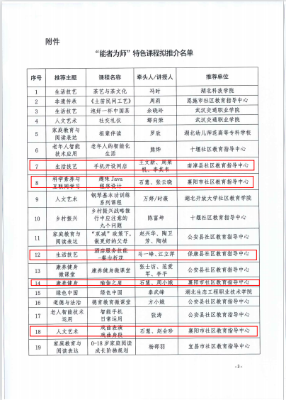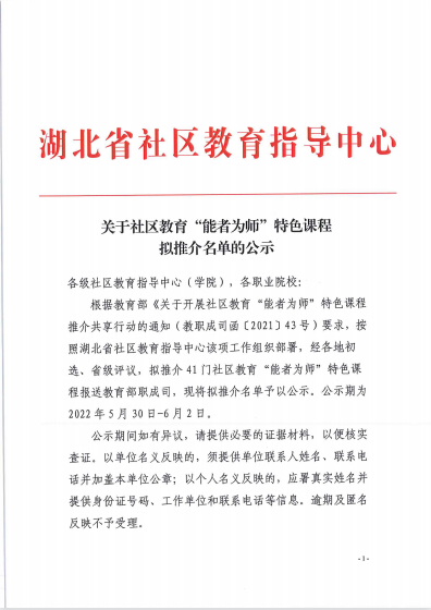 湖北省社区教育指导中心博鱼登录社区教育“能者为师”特色课程拟推介名单的公示