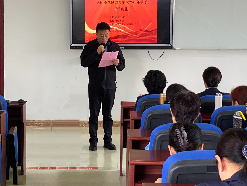 10月13日上午9点,襄阳社区教育学院在电大教学楼四楼阶梯教室举行了2023年秋季社区教育开学典礼。学校分管教学副校长包科杰莅临指导,开放教育工作部部长彭金玲、党总支书记张劲、社区教育学院院长曹鸿霞等相关领导、第一次课学员和开放教育工作部全体教职工参加了开学典礼。会议由曹鸿霞主持。