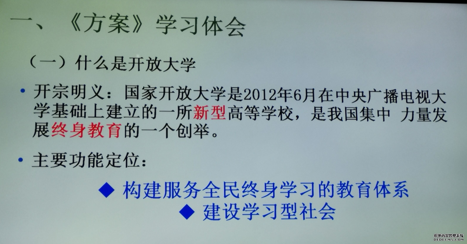 (通讯员:陶宏泉)10月30日下午,襄阳电大全体教工在三楼云教室开展《国家开放大学综合改革方案》(以下简称《方案》)专题学习。襄阳电大校长耿保荃、副校长程传红、吴仲平出席会议。会议由副校长程传红主持。