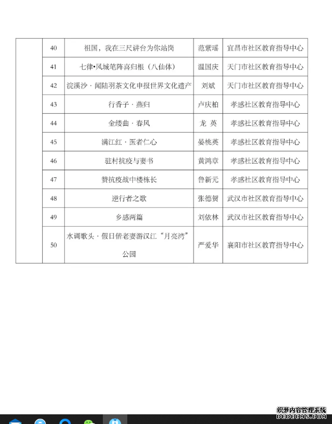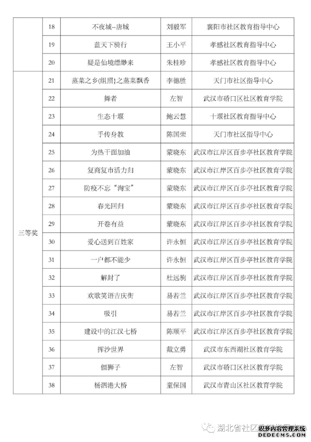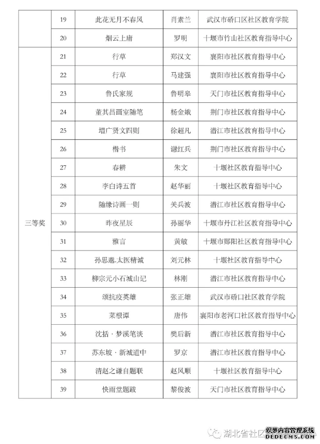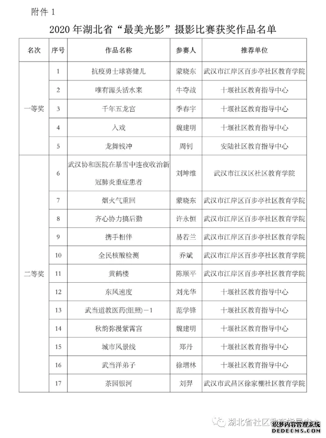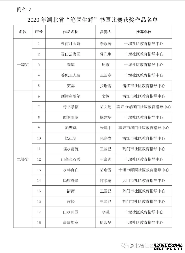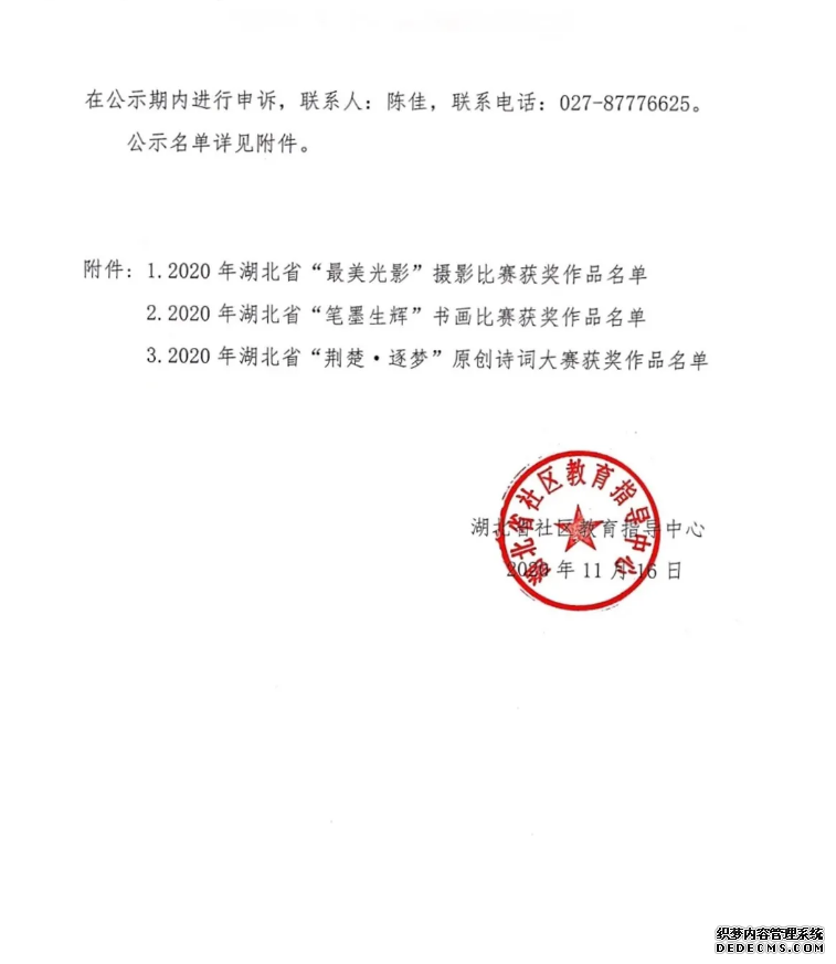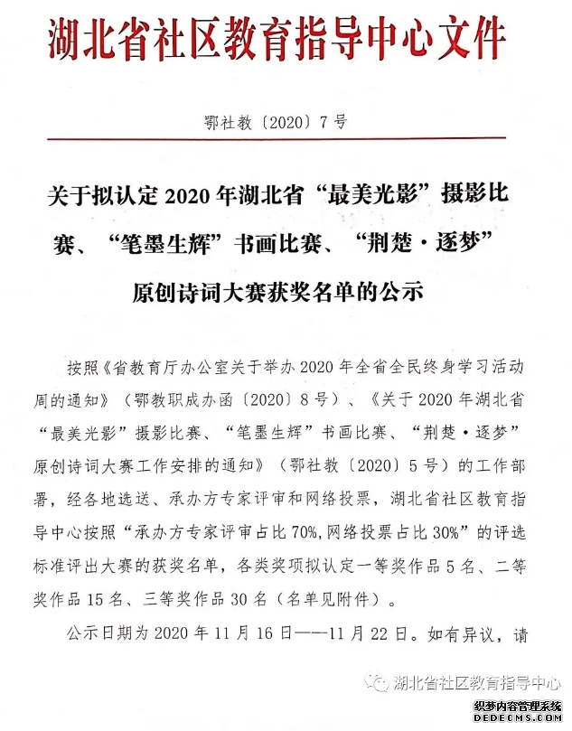 (通讯员:石慧)据悉:由湖北省社区教育指导中心主办的2020年“笔墨生辉”书画、“最美光影”摄影、“荆楚.逐梦”原创诗词三项大赛,经过专家评审、网络投票两个环节后后,现进入获奖名单公示阶段。