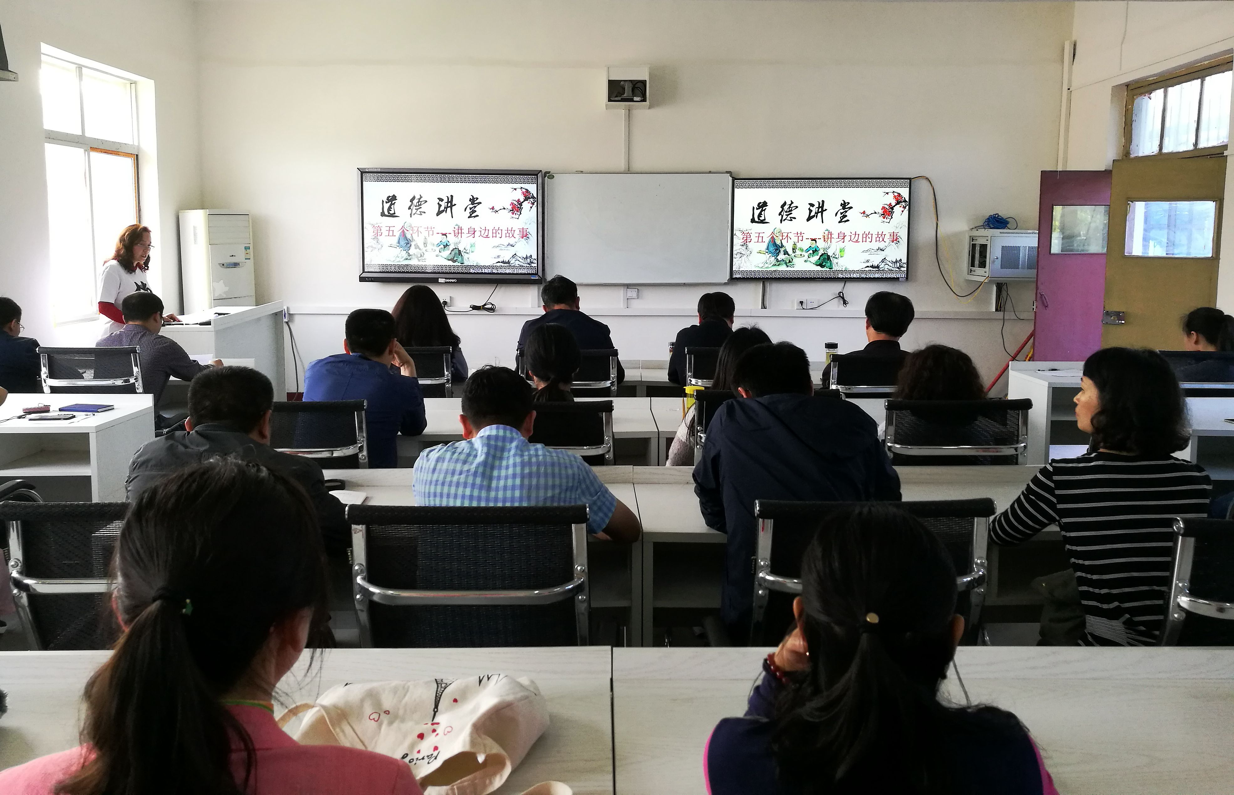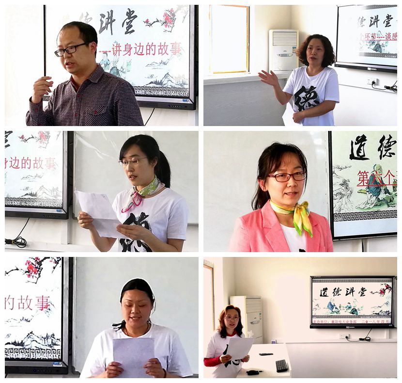 走进道德讲堂,沐浴道德洗礼,品悟道德力量,让心灵在道德讲堂净化。所有老师闭上双眼,俯视自己的内心,进入到活动第一个环节,进行了一次灵魂的反省自问:“作为教师,我的工作任务是什么? 我有没有做到爱岗敬业?怎样把工作做得更好?”第二环节边用手语边合唱的新型《三德歌》表演方式,传递着人间的孝德、诚德、爱德。第三个环节播放的2017年全国教书育人楷模刘发英事迹视频,全体教师无不被“英子姐姐”扎根山区教育事业,致力贫困学生资助的事迹所感动。“居之无倦,行之以忠”、 “鞠躬尽瘁,死而后已”, 循着先贤的足迹,倾听古人的教悔,感知历史的脉搏进入第四个诵经典环节,通过经典古语的品味、诵读来领悟和践行爱岗敬业、无私奉献的精神。第五、第六个环节,讲身边的事、谈内心的感悟,五位老师的发言使大家感觉榜样就在身边,看得到,也学得到,他们在平凡的岗位中兢兢业业、任劳任怨,尽职尽责,处处彰显敬业爱岗的正能量。第七个环节向德鞠躬,用“德”来凝聚和传递崇德向善,见贤思齐的美德。第八个环节做善事,每人活动后做一件善事。让我们携起手来,从我做起,从小事做起,从现在做起,立于德,践于行。