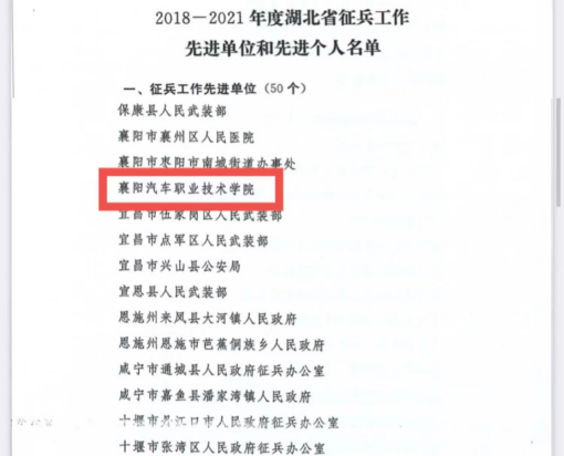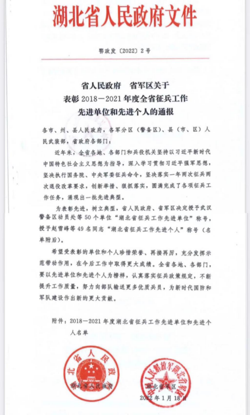 近日,湖北省人民政府印发《博鱼登录表彰2018-2021年度全省征兵工作先进单位和先进个人的通报》(鄂政发〔2022〕2号),我校获评2018-2021年度湖北省征兵工作先进单位。