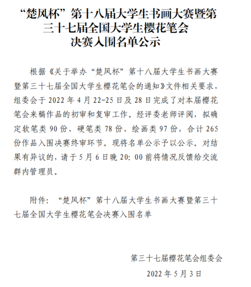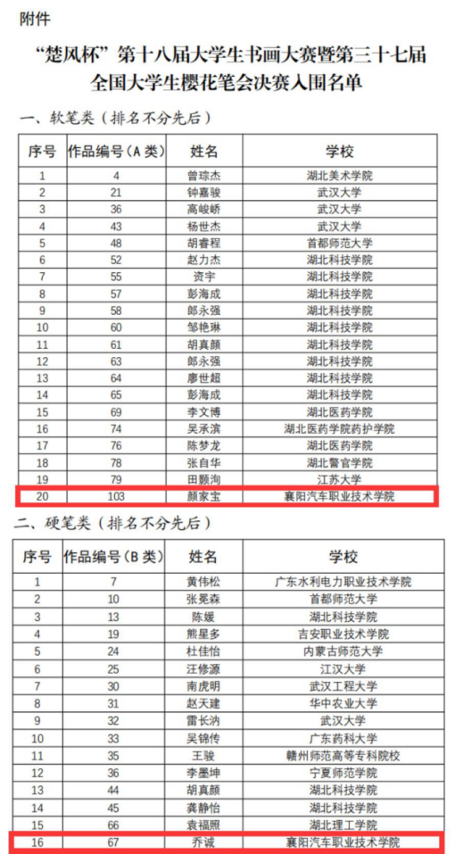日前,“楚风杯”第十八届大学生书画大赛暨第三十七届樱花笔会决赛入围名单公示。我校颜家宝同学入围软笔组决赛,乔城同学入围硬笔组决赛。