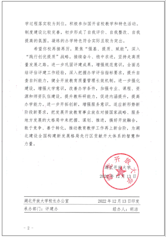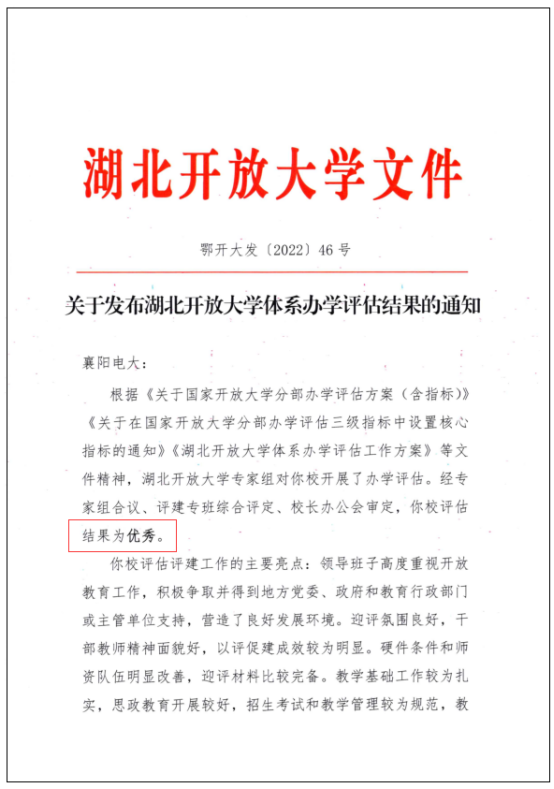 喜报:根据《博鱼登录国家开放大学分部办学评估方案(含指标)》《博鱼登录在国家开放大学分部办学评估三级指标中设置核心指标的通知》《湖北开放大学体系办学评估工作方案》等文件精神,湖北开放大学专家组2022年对我校开展了办学评估。经专家组会议、评建专班综合评定、校长办公会审定,我校喜获湖北开放大学体系办学评估优秀等级。