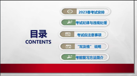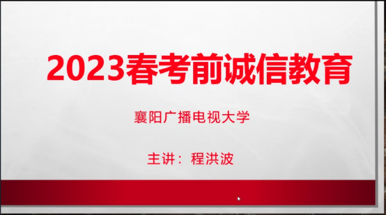 襄阳电大校本部于2023年6月26日19:00-20:30在线上开展23春考前诚信教育,以此来端正学风、严肃考风,维护考试的公平、公正,加强学生考前诚信教育,确保电大终考工作安全、平稳、有序进行。