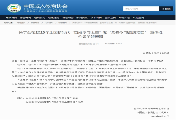 根据《博鱼登录做好2023年全国新时代“百姓学习之星”和“终身学习品牌项目”宣传推介工作的通知》(教职成司函〔2023〕17号)文件精神,在省、市级报送基础上,经中国成人教育协会组织全民终身学习活动周专家小组认真审定、全民终身学习活动周领导小组复核、公示等程序, 我市推送的《“云”游乡村话振兴》项目在全省推介中脱颖而出并获批2023年全国新时代“终身学习品牌项目”。