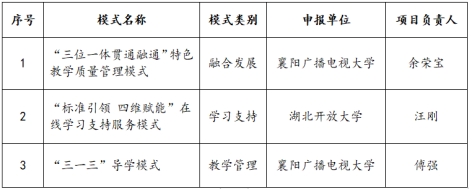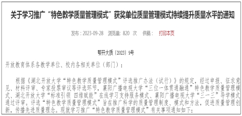 2023年9月28日,湖北开放大学发布博鱼登录学习推广“特色教学质量管理模式”的通知,我校申报的“‘三位一体贯通融通’特色教学质量管理模式”、和“‘三一三’导学模式”通过评审,并被评选为全省开大体系特色教学质量管理模式。