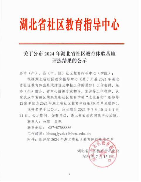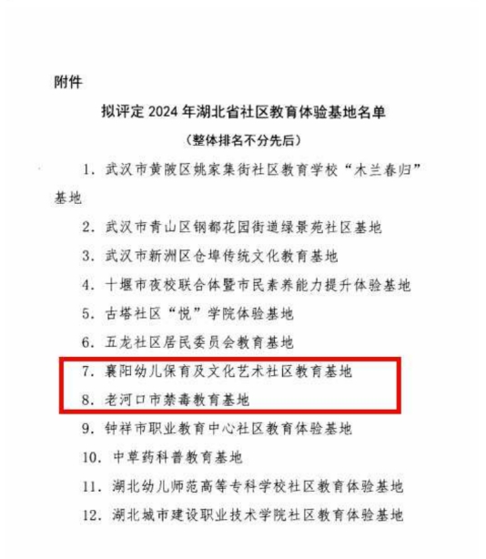 昨日,湖北省社区教育指导中心公布了社区教育体验基地的最新评选结果。我市荣幸地有两家基地成功获得了湖北省社区教育体验基地的认定。这两家基地分别为我校直属工业学校“襄阳幼儿保育及文化艺术社区教育基地”,以及老河口市社区教育指导中心推介的“老河口市禁毒教育基地”。