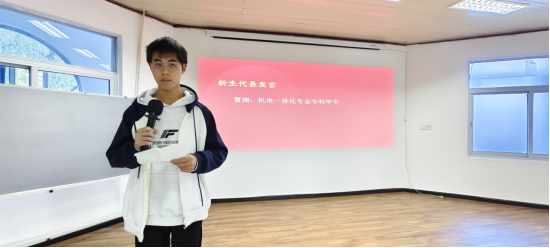 新生代表24秋机电一体化专业专科同学曹渊发言,作为电大新生,我们要秉持求知之心,在电大开启新的学习征程;在电大的舞台上,努力奋进,为梦想奋楫笃行。