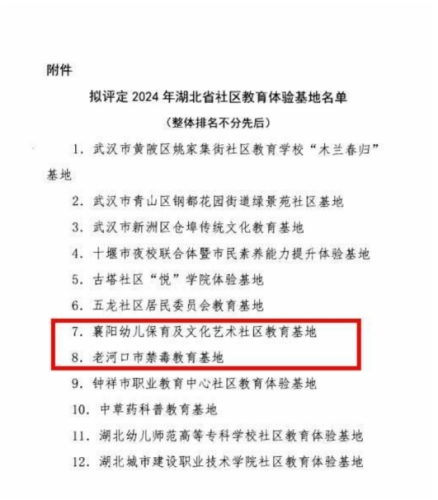 根据湖北省社区教育指导中心《博鱼登录开展2024年湖北省社区教育体验基地建设及申报工作的通知》工作安排,经市(州)推介,省中心组织专家初评、复评等工作程序,我市推介的由襄阳市工业学校、老河口市社区教育指导中心两家单位申报的《襄阳幼儿保育及文化艺术社区教育基地》、《老河口禁毒教育基地》获得2024年湖北省社区教育体验基地称号。