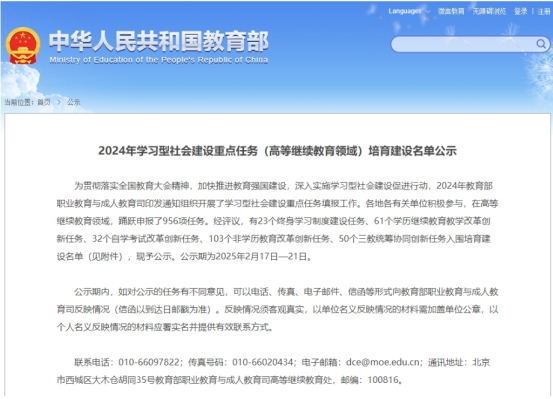 近日,教育部公示2024年学习型社会建设重点任务(高等继续教育领域)培育建设名单。经评议,有23个终身学习制度建设任务、61个学历继续教育教学改革创新任务、32个自学考试改革创新任务、103个非学历教育改革创新任务、50个三教统筹协同创新任务入围培育建设名单。我校“终身教育视域下职业教育、开放教育与继续(社区)教育融通路径研究”项目入围三教统筹协同创新任务名单。