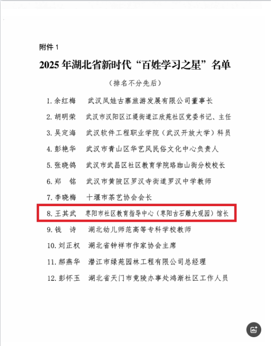 据湖北省社区教育指导中心《博鱼登录公布2025年湖北省新时代“百姓学习之星”“终身学习品牌项目”评审结果的通知》获知,我市枣阳市社区教育指导中心选送的枣阳古石雕大观园馆长王其武和襄阳汽车职业技术学院(博鱼登录)、襄阳市社区教育指导中心选送的“襄情乡爱”经市(州)中心初评、省中心复评,网上公示无异议认定后,分别被评为2025年湖北省新时代“百姓学习之星”和2025年
