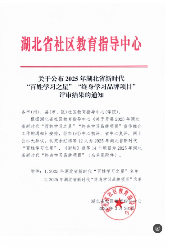 近悉,我市两地分别获得2025年湖北省新时代“百姓学习之星”“终身学习品牌项目”荣誉。