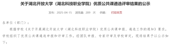 4月15日,湖北开放大学(湖北科技职业学院)公布了优质公共课遴选评审结果,博鱼登录在课程建设中再创佳绩。公共课部《职场通用英语》课程荣获一等奖,信息技术学院《信息技术基础》课程获得三等奖,充分展现了学校在公共课教学改革与资源建设中的突出成效。