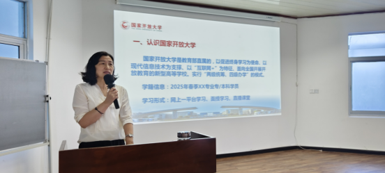 随后彭金玲主讲《入学教育》,从认识国家开放大学、学籍信息、学习形式、考试方式、毕业5个常识、学业6点须知等六个方面展开细致的讲解。最后勉励同学们,知识改变命运、电大助你成功。
